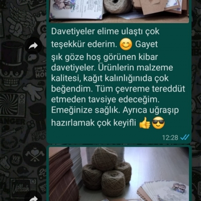 Davetiyelerim geldi gerçekten çok güzel ve başarılı bir çalışma olmuş.Elinize emeğinize sağlık tereddütsüz sipariş verebilirsiniz çok teşekürler emeği geçen herkese.